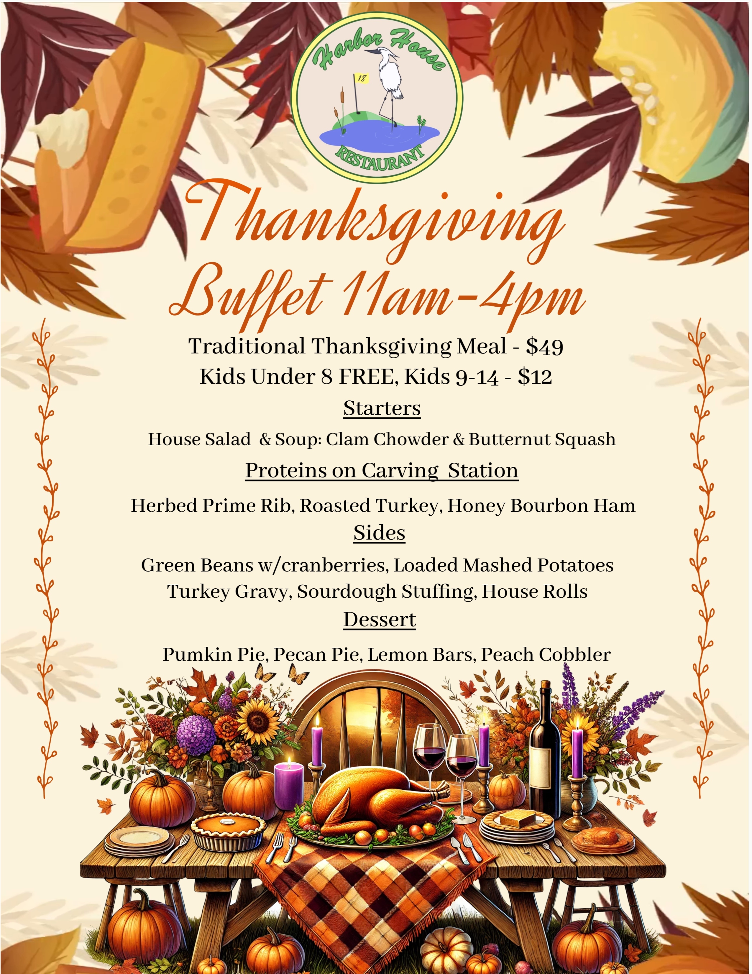 Harbor Links Thanksgiving Buffet November 22, 2025 by Date: November 27, 2025 Time: 11:00 am to 4:00 pm Thanksgiving Buffet at the Harbor House Restaurant